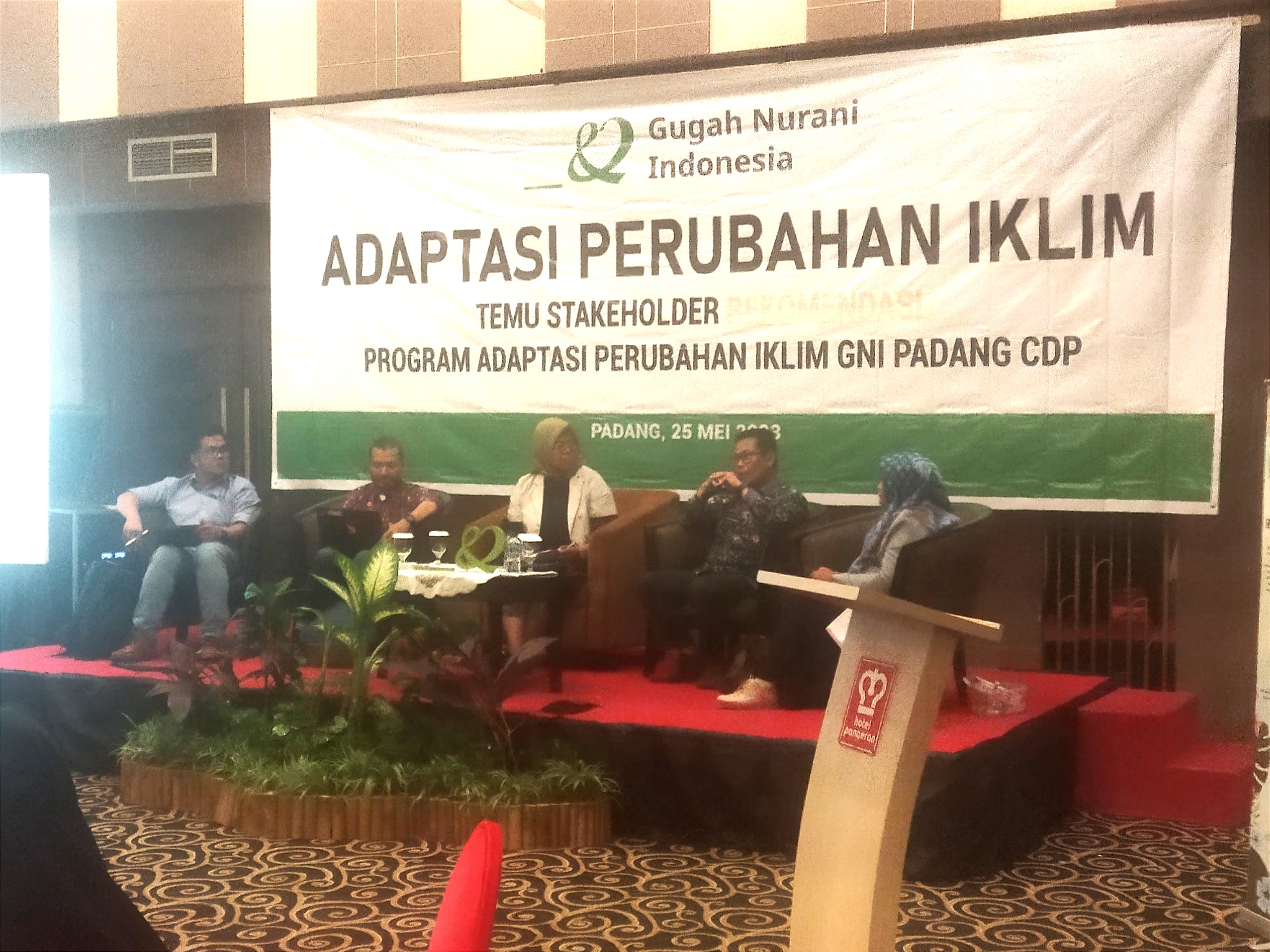 Padang, - Gugah Nurani Indonesia (GNI) Padang kembali melakukan sebuah Diskusi Publik Pertemuan Pemangku Kepentingan Kesiapsiagaan Dalam Menghadapi Perubahan Iklim, Kamis (25/5-2023) di Pangeran Hotel Padang.Acara kali ini merupakan puncak dari Program GNI CDP Padang, adaptasi perubahan iklim yang telah mereka lakukan dalam periode 2022-2023. Dimana dalam kegiatan tersebut GNI melakukan pendampingan terhadap 541 orang dari Kelurahan Pasie Nan Tigo dan Kelurahan Padang Sarai.