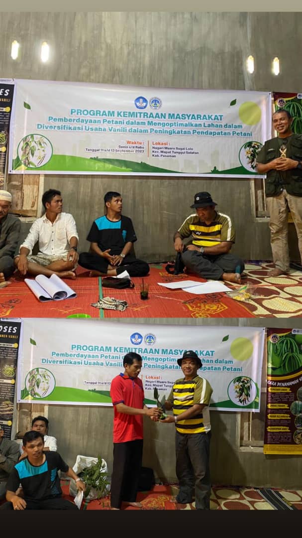 Pasaman, - Budidaya Vanili dan tingkatkan income petani di Pasaman menjadi tujuan Dosen UNP yang difasilitasi LP2M UNP tergabung pada Tim pengabdi Dosen Departemen Pendidikan Ekonomi dan Departemen Fisika Universitas Negeri Padang (UNP) menggelar rangkaian Pengabdian kepada Masyarakat (PkM).PkM dengan judul “Pemberdayaan Petani dalam Mengoptimalkan Lahan dalam Diversifikasi Usaha Vanili Peningkatan Pendapatan Petani”.