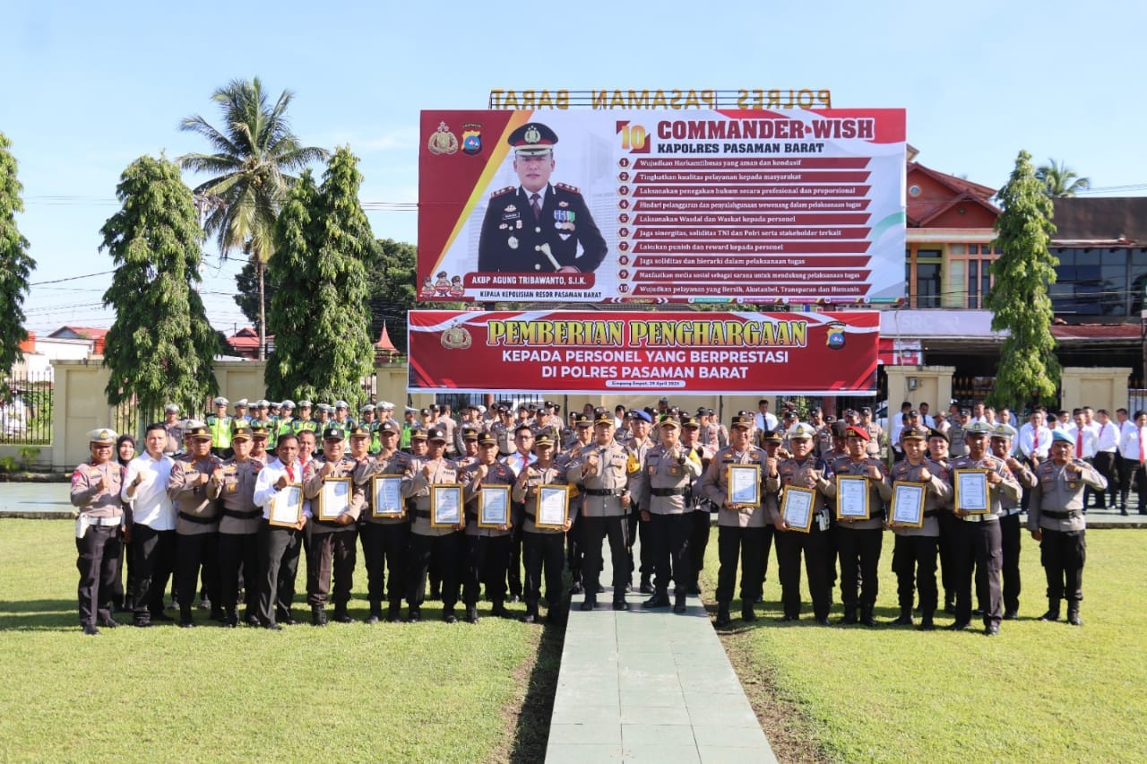 Pasaman Barat - Kepolisian Resor Pasaman Barat, Polda Sumatera Barat (Sumbar) menggelar upacara pemberian penghargaan kepada personel yang berprestasi, yang dilaksanakan di Halaman Mako Polres setempat, Senin 29/4-2024 pagi.Bertindak sebagai Inspektur upacara yaitu Kapolres Pasaman Barat AKBP Agung Tribawanto, S.Ik dan komandan upacara Kaur Bin Ops Satuan Samapta Ipda Fifriki Candra, serta dihadiri dan diikuti oleh para Kabag, Pejabat Utama (PJU), para personel, serta pengurus Bhayangkari Cabang Pasaman Barat