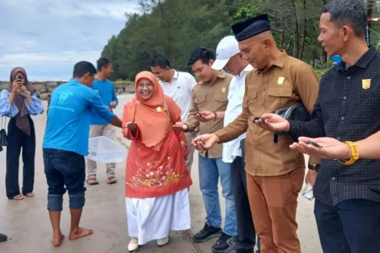 Pimpinan dan anggota Komisi II DPRD Sumbar turut serta dalam kegiatan rilis tukik atau anak penyu ke laut, Sabtu (2/11/2024). (Foto: Humas DPRD Sumbar)