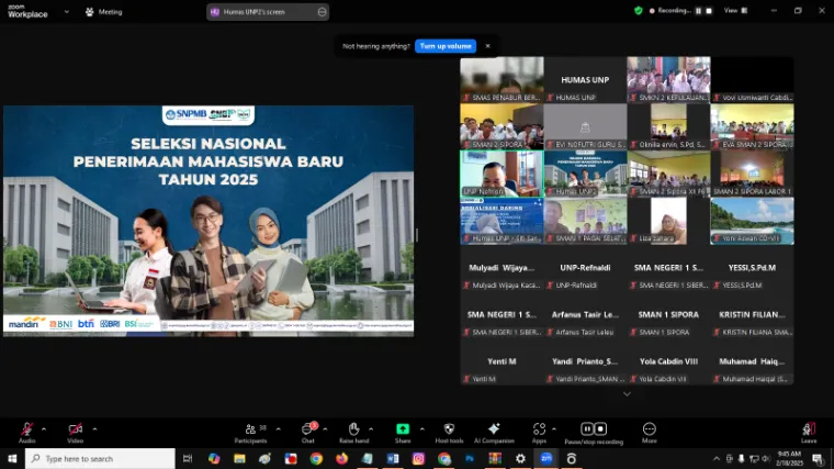 Padang— Universitas Negeri Padang (UNP) menggelar sosialisasi mengenai Seleksi Nasional Penerimaan Mahasiswa Baru (SNPMB) bagi siswa SMA/SMK se-Kabupaten Kepulauan Mentawai pada Selasa, (18/2). Acara ini berlangsung secara daring melalui aplikasi zoom meeting dan diikuti oleh ratusan siswa dari berbagai sekolah SMA/SMK se Kabupaten Kepulauan Mentawai.