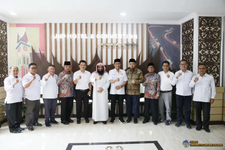 Padang – Atase Agama Kedutaan Besar Arab Saudi di Jakarta, Syaikh Ahmad bin Isa Al-Hazimi, melakukan kunjungan kerja ke Universitas Negeri Padang (UNP) dalam rangka memberikan kuliah umum. Kedatangannya disambut hangat oleh Rektor UNP Ir. Krismadinata, Ph.D di UNP Hotel & Convention Center (25/2) dan berbagai pihak, termasuk Wakil Rektor PKs & HI (Perencanaan, Kerja Sama dan Hubungan Internasional) Dr. rer. Nat. Deski Beri, Ketua Lembaga Kerapatan Adat Alam Minangkabau (LKAAM), Fauzi Bahar, Dekan FIS dan Wakil Dekan Bidang Keuangan, Sumber Daya, Kerja Sama dan Umum, serta dai yang bernaung di bawah Atase Agama Arab Saudi, Buya Muhammad Elvi Syam.