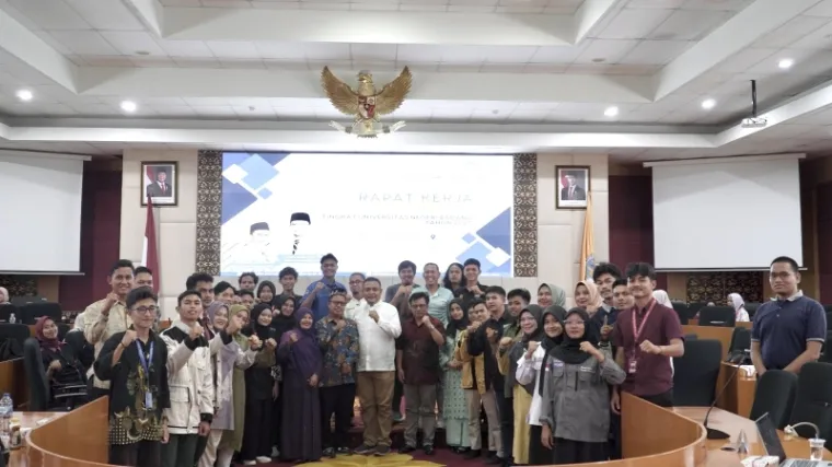 Padang-- Universitas Negeri Padang (UNP) menggelar Rapat Kerja (Raker) Organisasi Kemahasiswaan Tingkat Universitas selama dua hari, mulai Jumat hingga Sabtu, 9–10 Mei 2025. Kegiatan ini dibuka secara resmi oleh Direktur Kemahasiswaan UNP, Dr. Asep Sujana Wahyuri, S.Si., M.Pd. yang mewakili Rektor, bertempat di ruang sidang senat lantai 4 Gedung Rektorat and Research Center UNP, pukul 09.00 WIB.
