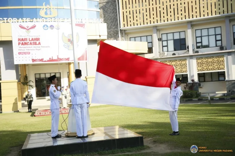 Padang - Universitas Negeri Padang (UNP) menggelar upacara peringatan Hari Lahir Pancasila tahun 2025 pada Senin, (2/6/2025), di Lapangan Depan Gedung Rektorat UNP. Upacara yang berlangsung khidmat ini mengusung tema nasional “Memperkokoh Ideologi Pancasila Menuju Indonesia Raya” dan diikuti oleh civitas akademika UNP, mulai dari pimpinan, dosen, tenaga kependidikan, satuan pengamanan (satpam), hingga mahasiswa.