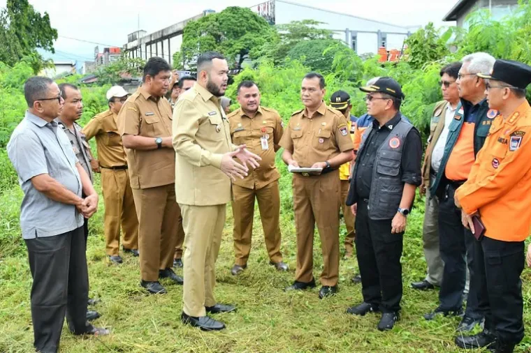 Padang, - Wali Kota Padang, Fadly Amran, mendampingi Sekretaris Utama Badan Nasional Penanggulangan Bencana (Sestama BNPB), Rustian, meninjau dua lokasi lahan aset Pemerintah Kota (Pemko) Padang yang direncanakan untuk pembangunan Hunian Sementara (Huntara) dan Hunian Tetap (Huntap), Senin (15/12/2025).