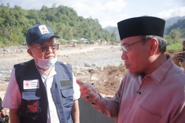 Padang, - Wakil Wali Kota Padang Maigus Nasir mendampingi Ketua Umum Palang Merah Indonesia (PMI) Jusuf Kalla meninjau lokasi bencana alam di kawasan Batu Busuk, tepatnya di sekitar SMPN 44 Padang, Kecamatan Pauh, Sabtu (20/12/2025).