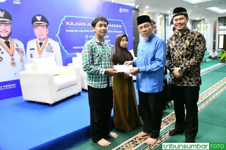 Wakil Wali Kota Padang Maigus Nasir menyerahkan santunan kepada santri dan anak yatim dalam kegiatan Kajian Adem Ramadan di Masjid Agung Nurul Iman, Kota Padang, Minggu (8/3/2026). (Foto: Ist)