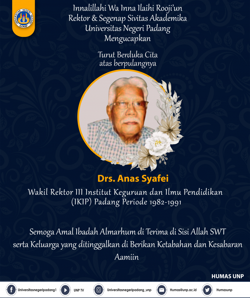 Innalillahi Wa Inna Ilaihi Rooji’unRektor & Segenap Sivitas Akademika Universitas Negeri Padang Mengucapkan Turut Berduka Cita atas berpulangnya Drs. Anas Syafei Wakil Rektor III Institut Keguruan dan Ilmu Pendidikan (IKIP) Padang Periode 1982-1991, Pada hari ini Kamis 22 Februari 2024.